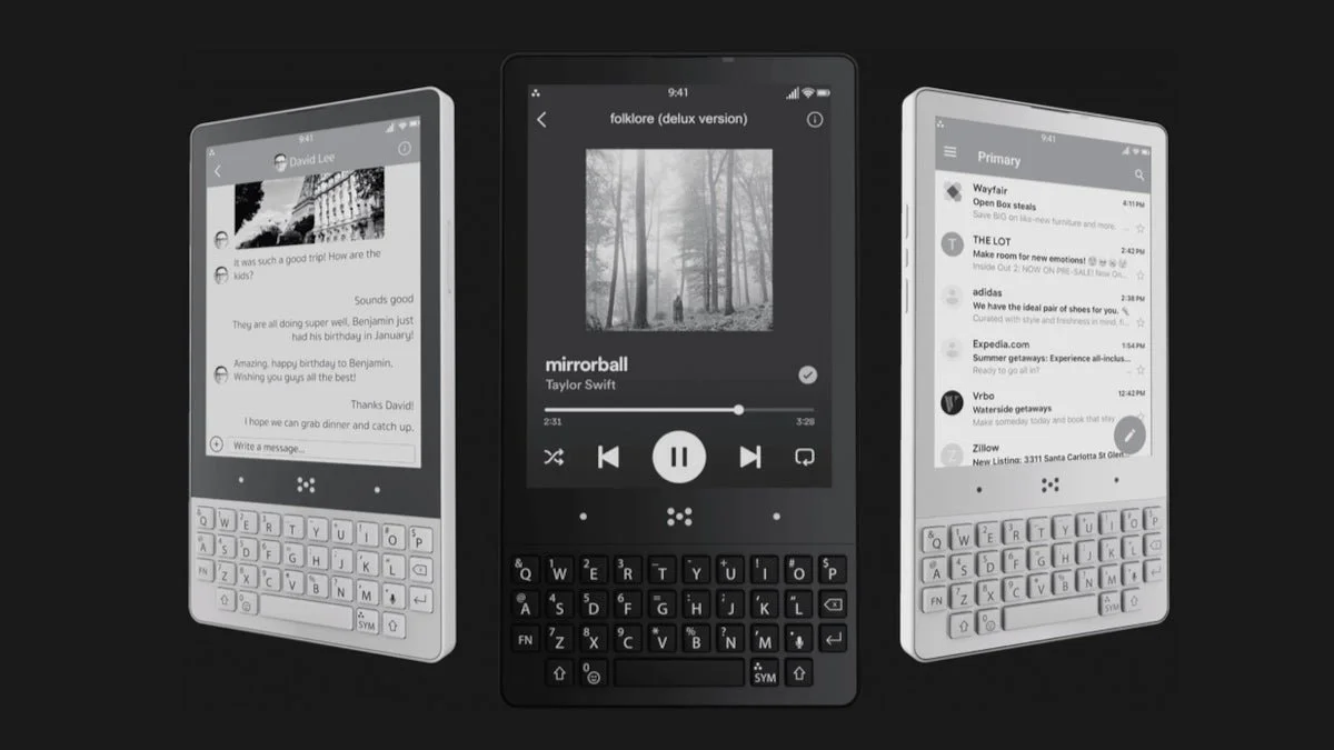 An ePaper display for eye comfort optimal power consumption, combined with a full-QWERTY keyboard.
